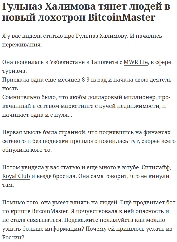 Робот BitcoinMaster не выглядит как надежный проект. Нет даже подтверждений того, что он вообще существуют: не выходят убедительные отчеты по проведенным им сделкам, пользователям не показывают код.За созданием проекта стоит известный MLM-деятель Гульназ Халимова. Она отметилась во многих пирамидах, часть из которых запустила сама. Например, она стояла за скамом Royal Club, жилищной пирамидой Сити Лайф и другими.