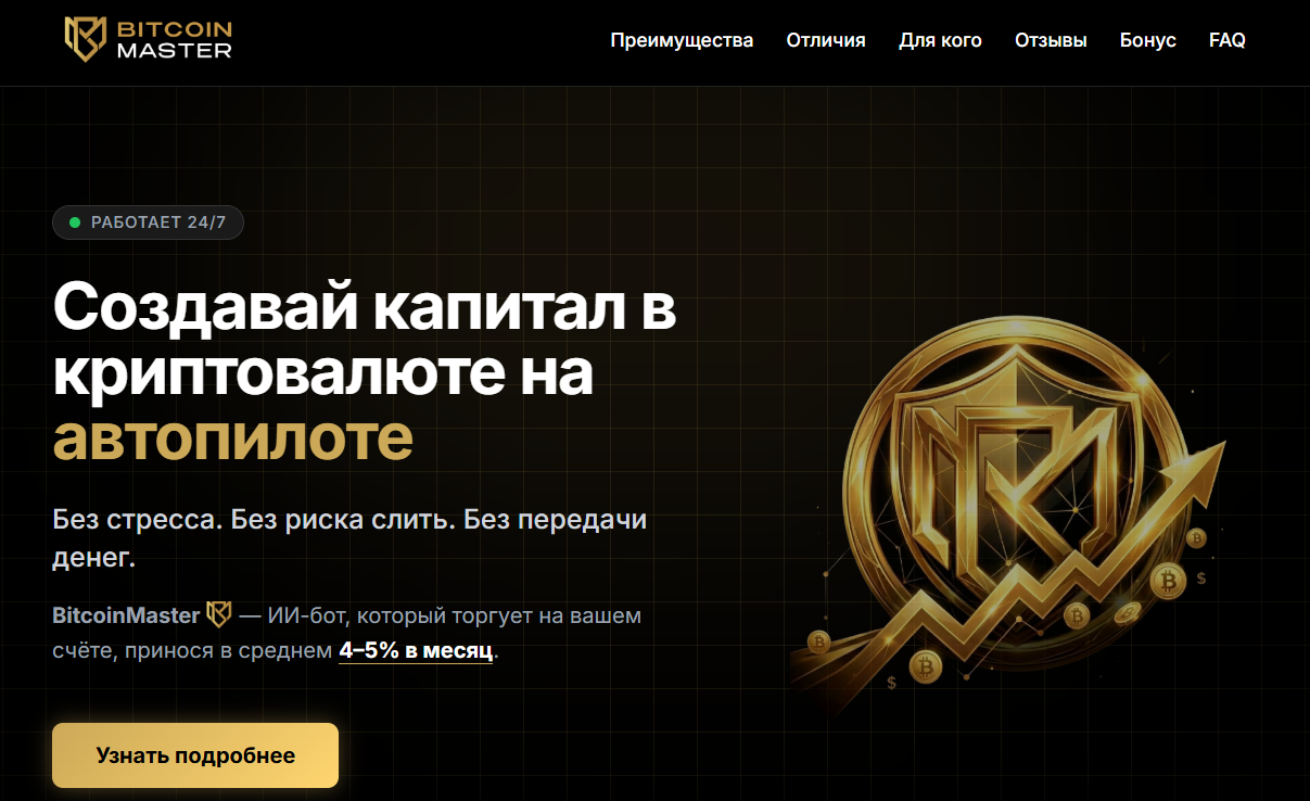Робот BitcoinMaster начали продвигать в 2025 году. Он создан неизвестными, которые которые якобы разработали торговый алгоритм на базе искусственного интеллекта, показывающий хороший результат на дистанции. Владельцы проекта врут о том, что он присутствует на рынке больше 5 лет.