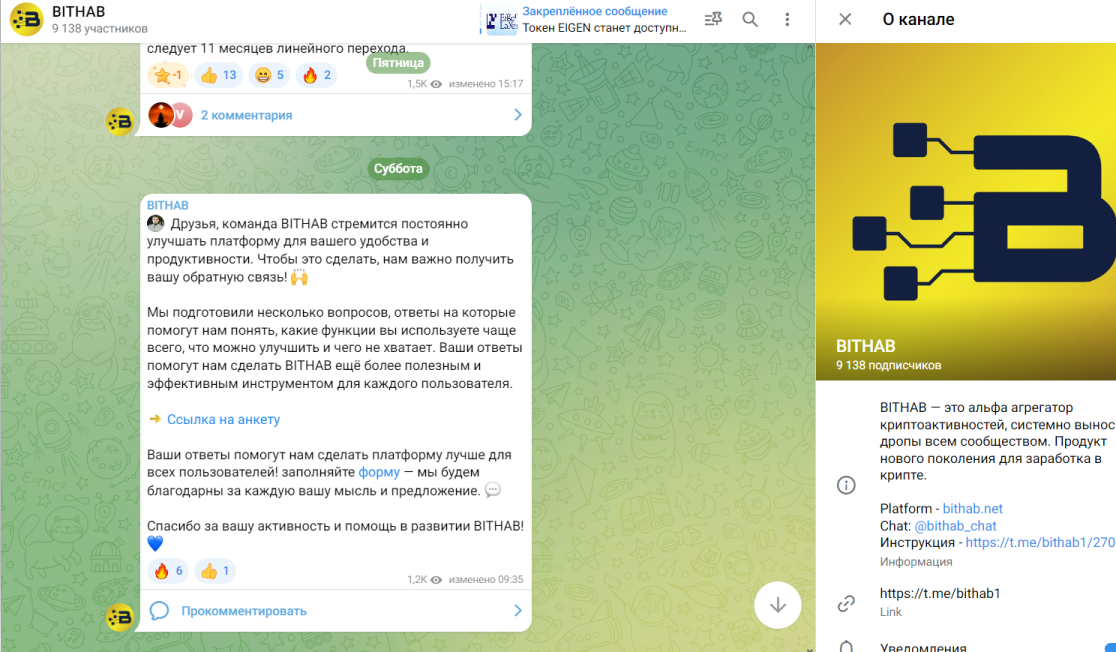 Создатели ведут Тг канал Bithab1. На сообщество подписано более 9 тысяч пользователей.