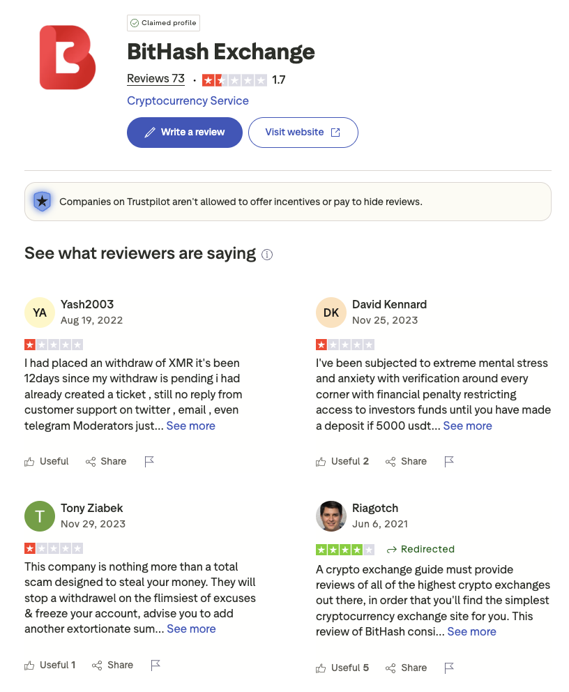 Фидбэк о Bit Hash сравнительно небольшой. Например, на популярном ревьюшнике Trust Pilot за почти 10 лет существования биржа заслужила всего 73 отзыва.