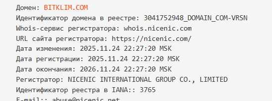 Дополнительный тревожный сигнал — возраст сайта. Домен был зарегистрирован 24 ноября 2025 года. На момент обзора 24 декабря 2025 года сайт существует ровно месяц.