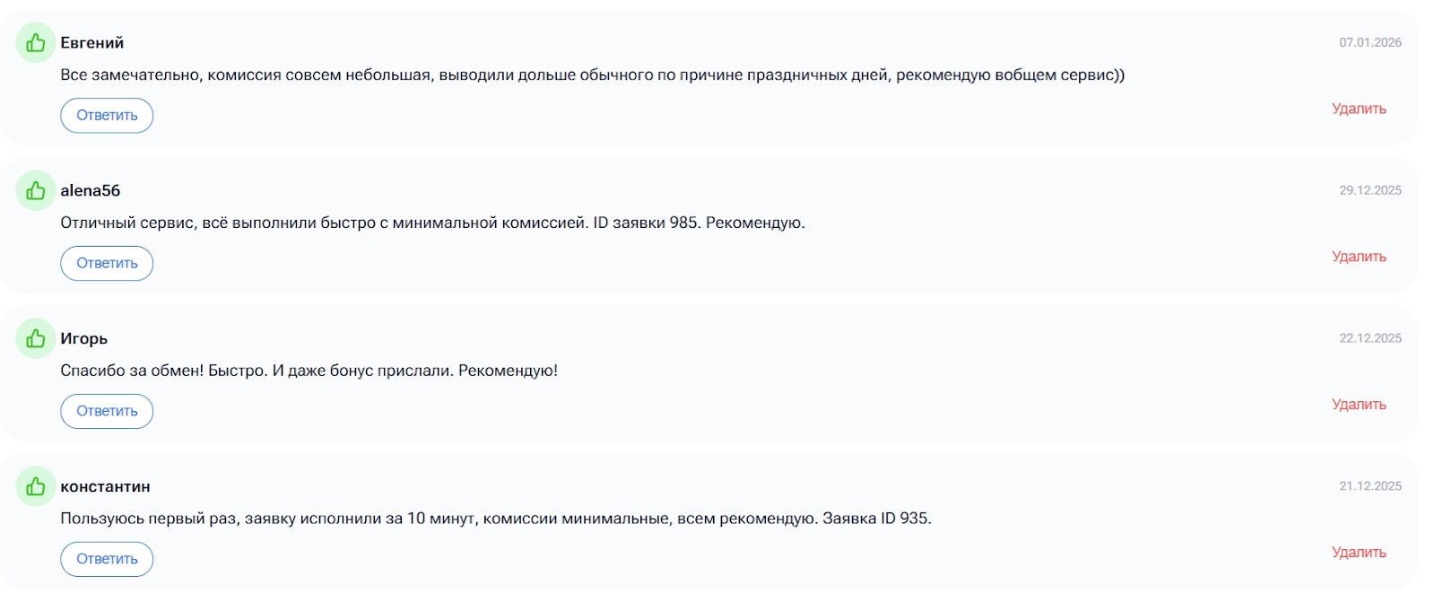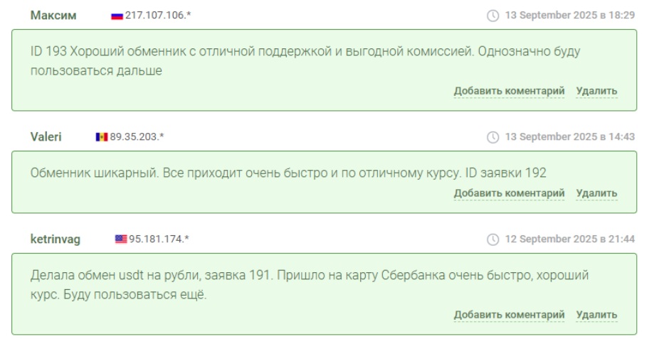 Многие отзывы носят типовой характер. К примеру, пользователь Константин пишет: «Пользуюсь первый раз, заявку исполнили за 10 минут, комиссии минимальные, всем рекомендую». Подобные сообщения формируют образ быстрого и честного сервиса.