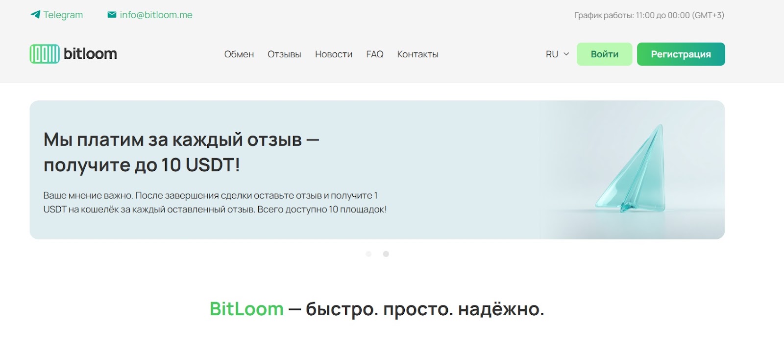 BitLoom — это просто обменник, который продвигает сам себя через сайт и Telegram-канал. Сервис называет себя современным и честным: обещает без скрытых комиссий, работу 24/7 и большие резервы — больше 1,5 миллиона долларов. Однако, на сайте указано, что поддержка работает ежедневно с 11:00 до 00:00, что противоречит заявлению о круглосуточной доступности.