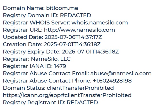 Проверка домена через WHOIS показывает, что сайт BitLoom.me был зарегистрирован 1 июля 2025 года. Таким образом, на момент анализа проект существует менее года. Это важный факт, который следует учитывать при оценке заявлений о надежности и устоявшейся репутации сервиса.