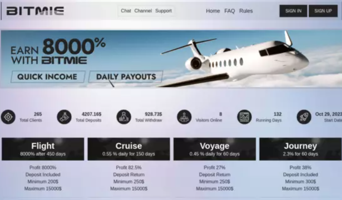 Bitmie pro — финансовая платформа, которая позволяет зарабатывать деньги на пассивной основе. Разработчики инвестиционного ресурса предлагают пользователям покупать специальные тарифы, чтобы получать плюс к прибыли без активного трейдинга. Вдобавок к этому, менеджеры компании по инвестициям, дабы завлечь пользователей, утверждают про высокую доходность — 8000% к депозиту за 450 дней. Но подтверждать прибыльность настоящей статистикой не собираются — финансовую отчетность команда платформы не демонстрирует.