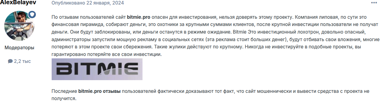 - О деятельности инвестиционного ресурса Bitmie pro есть только отрицательные отзывы, в которых пользователи пишут про однозначный развод.