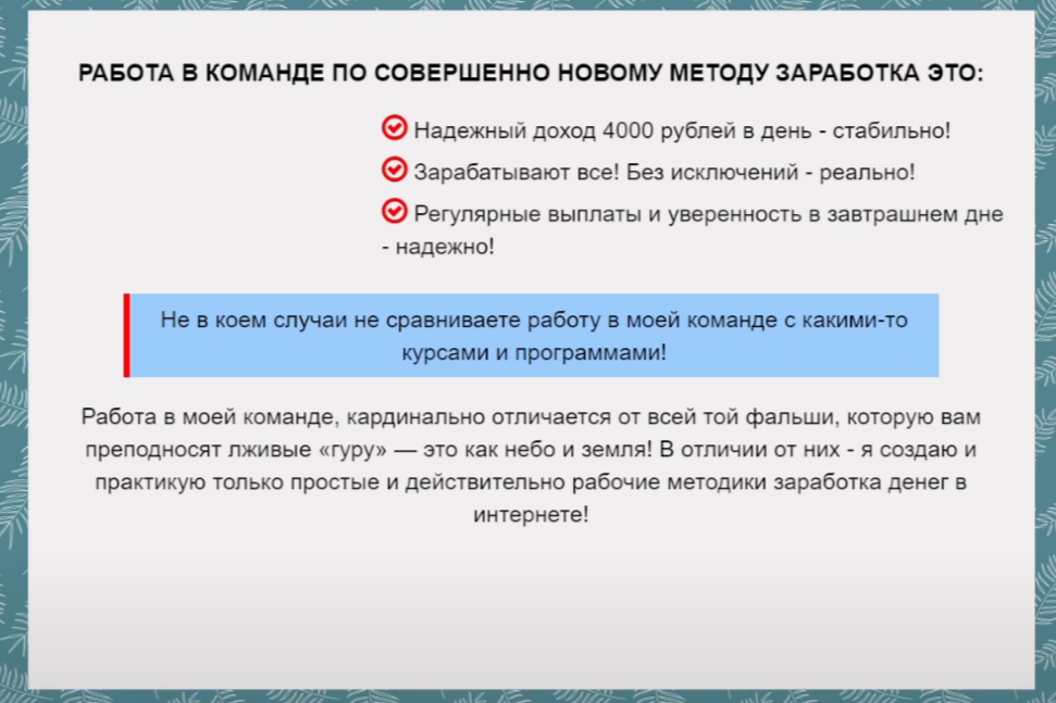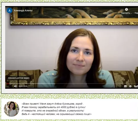 Здесь часто манипулируют фразами о том, что заработок вместе с компанией является высоким, гарантированным и стабильным. Это самая популярная ловушка от мошенников. Учитывая, что такой проект носит и другие названия, все явно намекает на то, что площадка не является настоящим сервисом для заработка. Причем основательница чаще всего не меняет свое имя. Но иногда встречаются идентичные проекты с куратором Аленой Кузнецовой.
