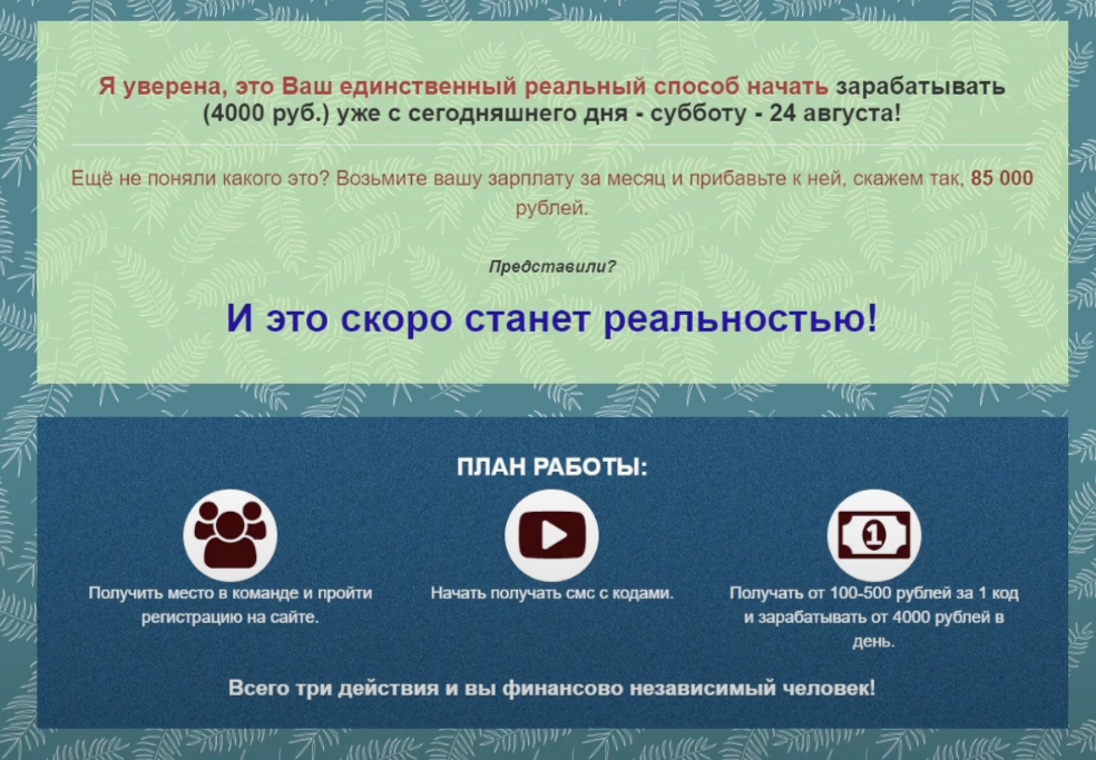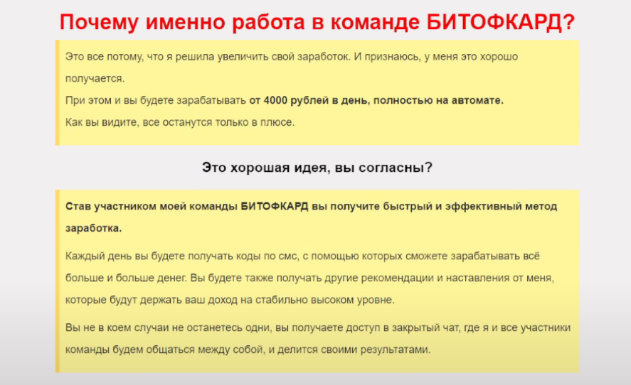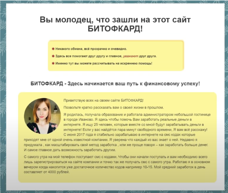 На сайте bitofkard ru уверяют, что вся их деятельность прозрачна, очевидна и не является обманом. Руководство не берет никаких взносов и комиссии, а наоборот, помогает получать доход. Для заработка стоит всего лишь попасть в команду к наставнице, зарегистрироваться на сайте компании, получать ежедневно те самые смс с кодами и вводить их на другом ресурсе.