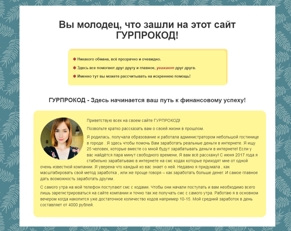 При проверке мы обнаружил, что личность данной девушки и предложение о подобном заработке висит на множестве сайтов, только с разными названиями. Например, сейчас функционируют ресурсы Гурпрокод, Дардаркод и Ютеркод, где все один в один, за исключением названия.