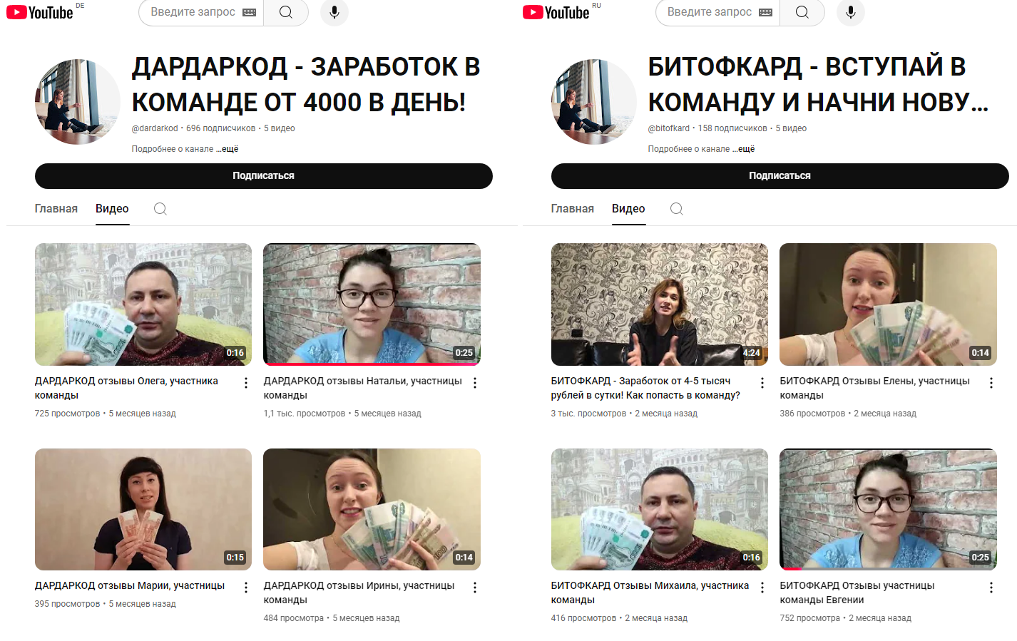 Для каждого из них создан и ютуб канал, где висят одни и те же видео-отзывы. Этот факт однозначно доказывает мошенническую деятельность проекта. Но помимо этого, фальшивую работу Битофкард выдает дешевый интерфейс, молодой возраст сайта и соцсетей, а также отрицательные отзывы о компании на просторах интернета.