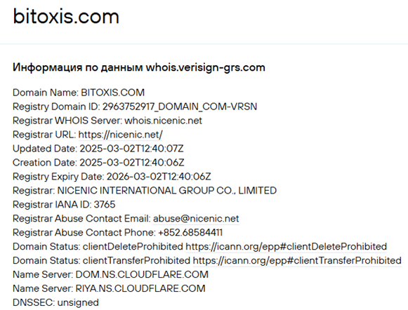 Более того, доменное имя Bitoxis com было создано в марте 2025 года, то есть платформа существует меньше месяца. Что явно аргумент не в пользу ее безопасности.