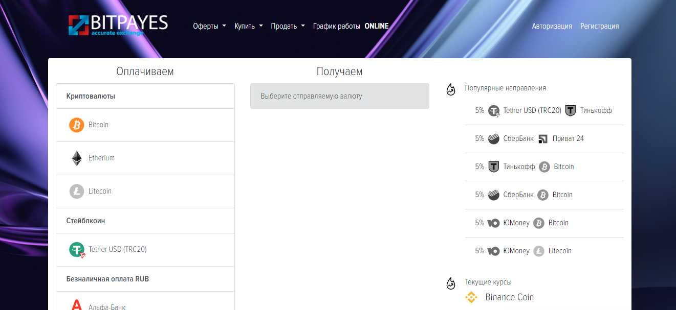 Bitpayes называет себя надежной платформой для обмена криптовалют. По словам авторов проекта, он предлагает выгодные курсы и обеспечивает быстрый, удобный и безопасный обмен. Платформа работает с 2018 года, поддерживает обмен популярных криптовалют и некоторых экзотических.