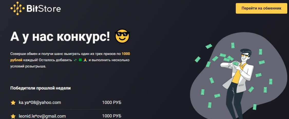 На сайте Бит Сторе проводились конкурсы: каждую неделю разыгрывались денежные призы среди клиентов, совершивших обмены. Победителей выбирали случайным образом через сервис random org, что добавляло элемент доверия и вовлеченности.