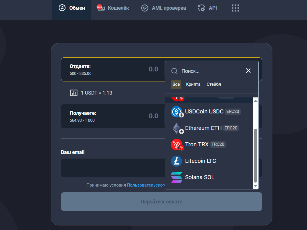 На сайте доступны три основные криптовалюты — Bitcoin, Ethereum и Tether, а также другие чуть менее популярные, как TRX, SOL и LTC.