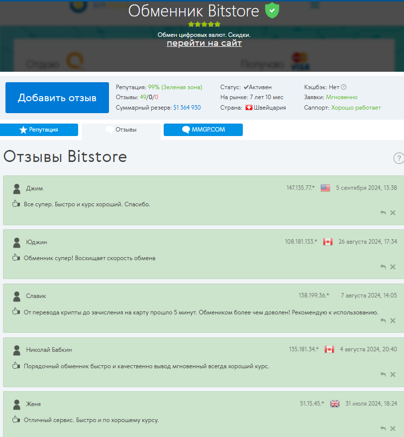 У оригинального Битсторе pro ситуация иная — ресурс работает, отзывы о нем в целом положительные. Пользователи отмечают быструю обработку заявок, честные курсы и прозрачные условия. Есть и недовольные, чаще всего жалуются на задержки при верификации, отсутствие горячей линии и редкие технические сбои.