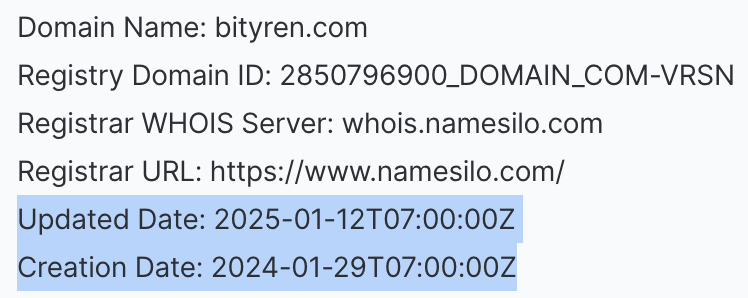 Домен bityren.com был зарегистрирован 29 января 2024 года. Спустя год информация о владельцах так и не была опубликована.