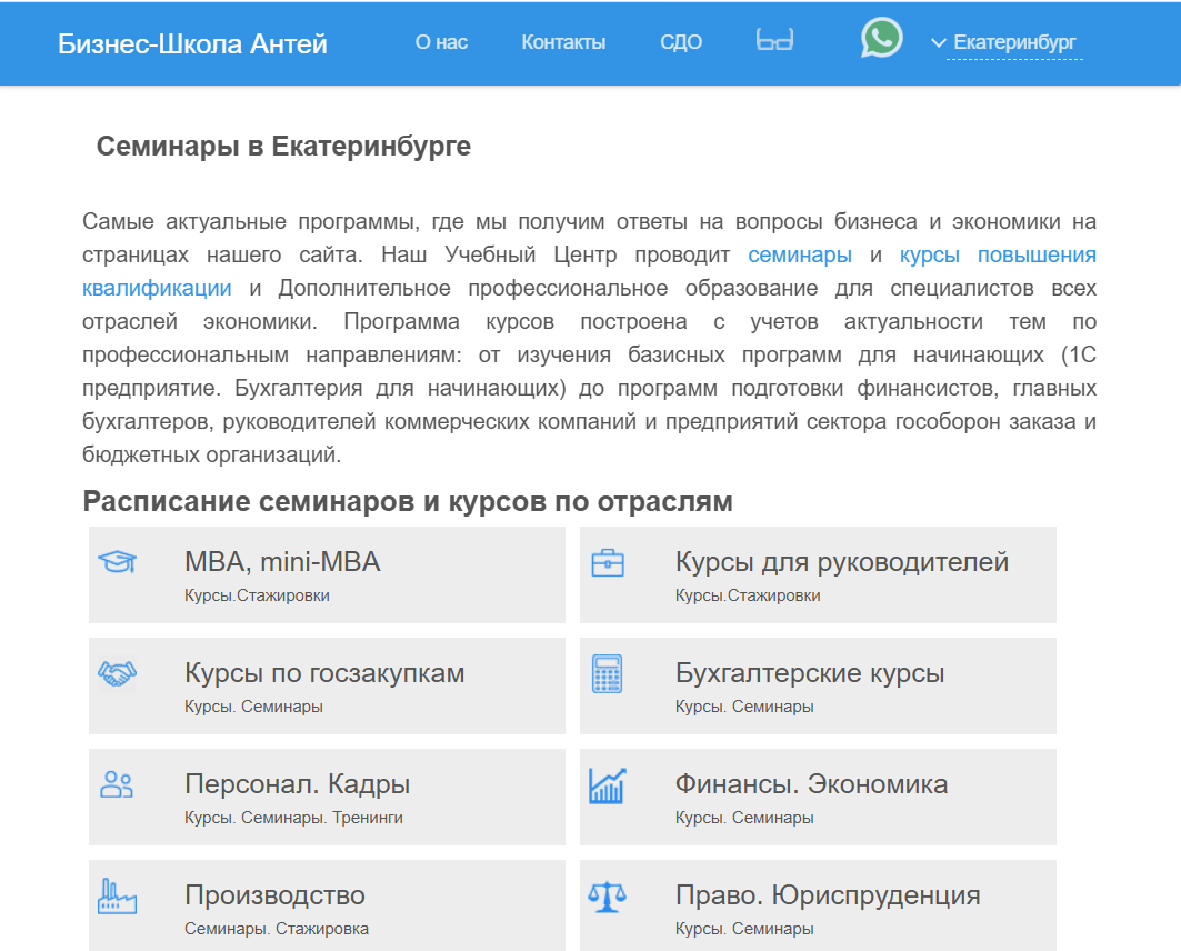 Официальный сайт – Treningi-seminary ru. На главной странице редакция делится своим видением на современное обучение: по словам основателей бизнес-школы «Антей», формат тренингов и семинаров не устаревает, особенно в сфере администрирования. Когда был основан проект – не сообщается. Головной офис расположен в Екатеринбурге, однако филиалы есть по всей России – в более чем 50 городах.