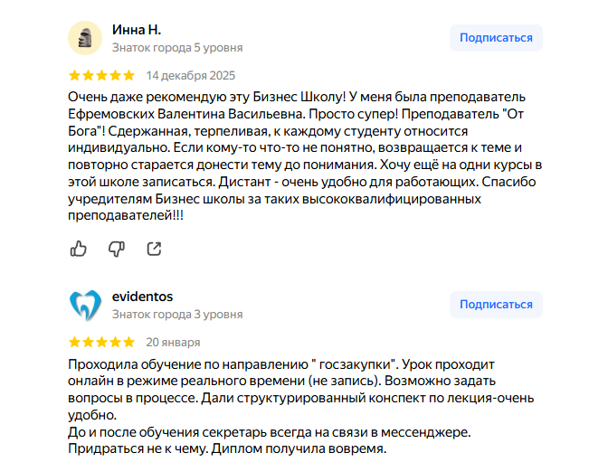 В интернете можно найти отзывы об обучении в бизнес-школе «Антей», в основном в городских справочниках, таких как «2Гис» и «Яндекс Карты». Репутация – положительная: выпускники благодарят наставников, рассказывают о хорошей полученной подготовке и получении дипломов государственного образца.