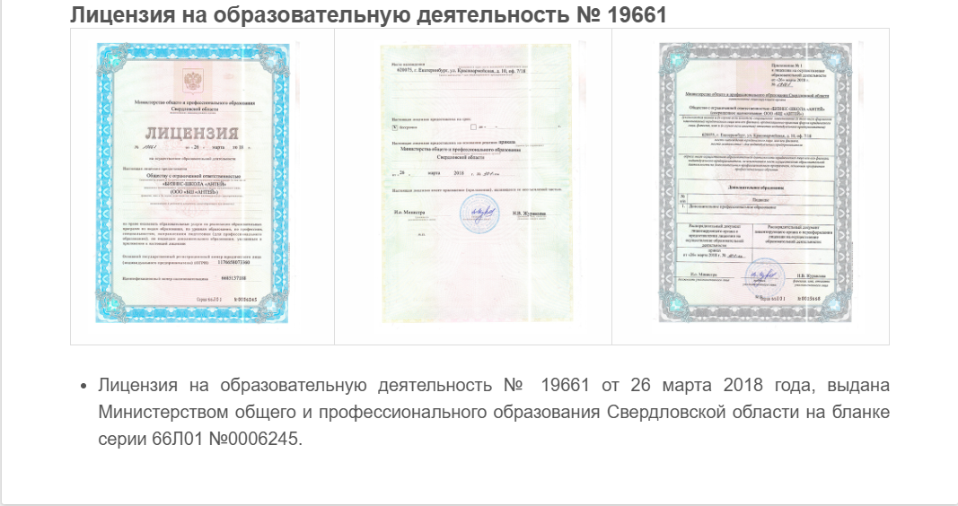 У организации есть юридическое лицо, зарегистрированное в Екатеринбурге в 2017 году. Академия имеет лицензию на ведение образовательной деятельности – это подтверждают открытые реестры и сама администрация, которая оставляет скан документа. Это положительный маркер для бизнес-школы «Антей», после прохождения курсов студенты получают дипломы государственного образца, а также могут рассчитывать на налоговый вычет.