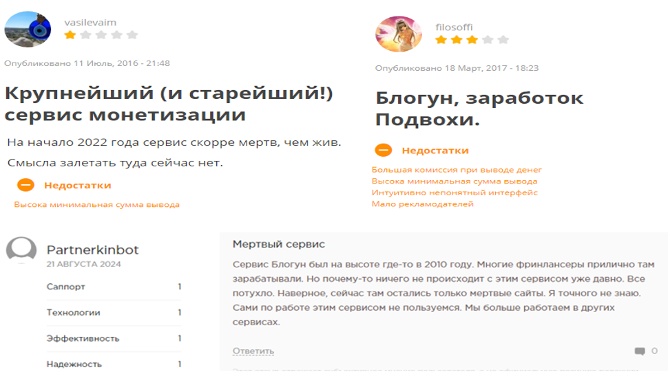 И это не единственный минус компании. В сети зафиксированы данные о том, что площадка уже давно соскамилась. Люди оставляют о некогда масштабном и популярном портале Blogun негативные отзывы.