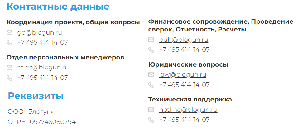 Организаторы портала демонстрируют адреса электронных почт: go blogun ru, sales blogun ru, buh blogun ru, law blogun ru, hotline blogun ru.