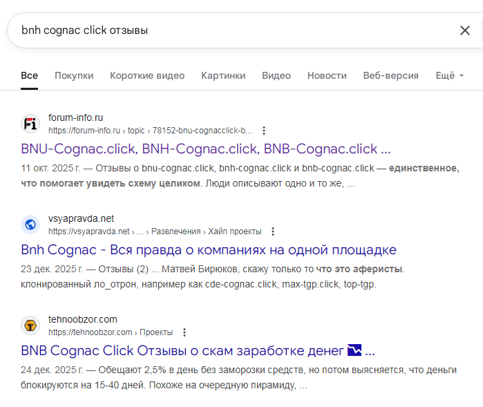 На просторах сети о фирме информации очень мало, что подтверждает ее молодой возраст и говорит о невостребованности. Юридических данных об организации не видно, что может свидетельствовать о ее нелегальной работе. Отзывов о ресурсе Https Bnh Cognac Click нет. Стоит заметить, что единственные статьи, в которых засветился источник, являются разоблачениями.