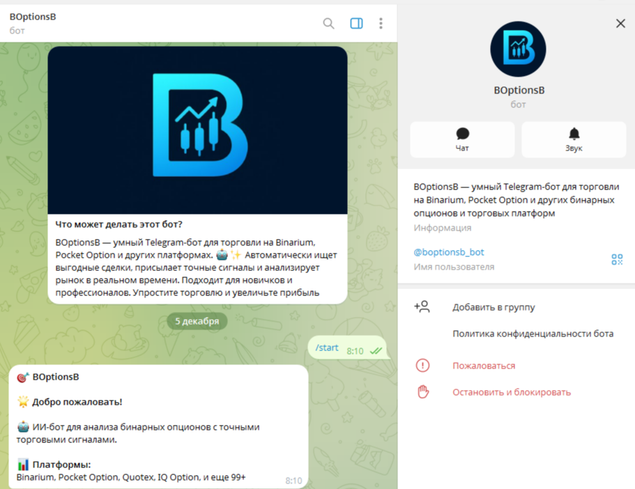 Телеграм-бот Boptionsb Bot встречает пользователей небольшим заготовленным сообщением о том, что это за проект и что он делает. Так мы выяснили, что ресурс предначен для торговли на различных платформах. Он автоматически находит выгодные сделки, присылает рабочие сигналы и проводит анализ рынка в реальном режиме.