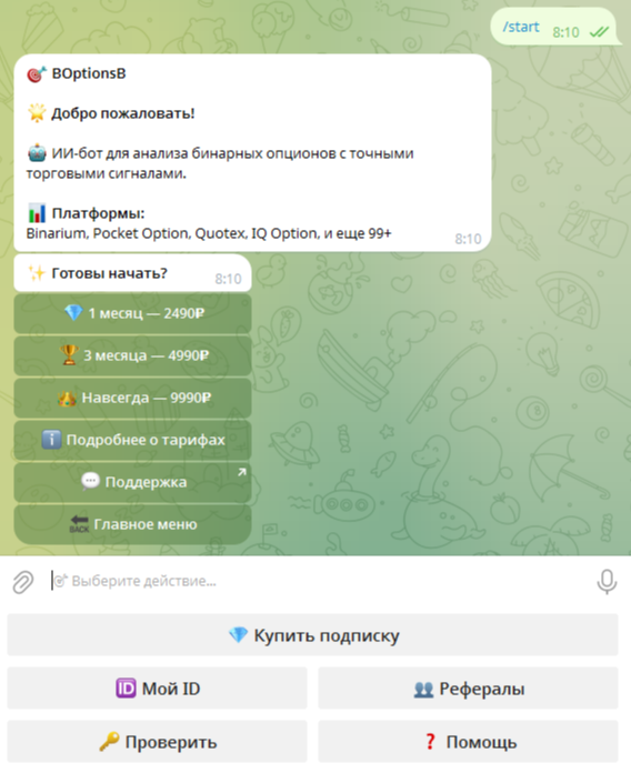 После запуска бота Boptionsb Bot, пользователям сразу приходит сообщение с доступными тарифами для подписки: