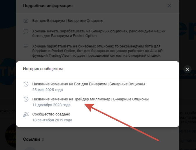 В характеристиках вк-группы @ binarium free signal указывается, что под этим названием она стала работать только с 25 мая 2025 года. До этого 1,5 года она называлась иначе. Сам паблик был создан в 2019 году.