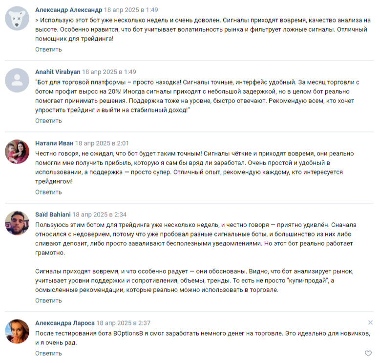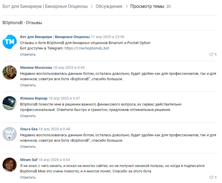 Изначально мы предположили, что источник был запущен 25 мая 2025 года. Однако в вк-группе проекта мы увидели, что первые отзывы в адрес бота Boptionsb Bot были оставлены на 1 месяц раньше. Причем это выглядят странно, так как они опубликованы друг за другом в один день и каждый с разницей в несколько минут.