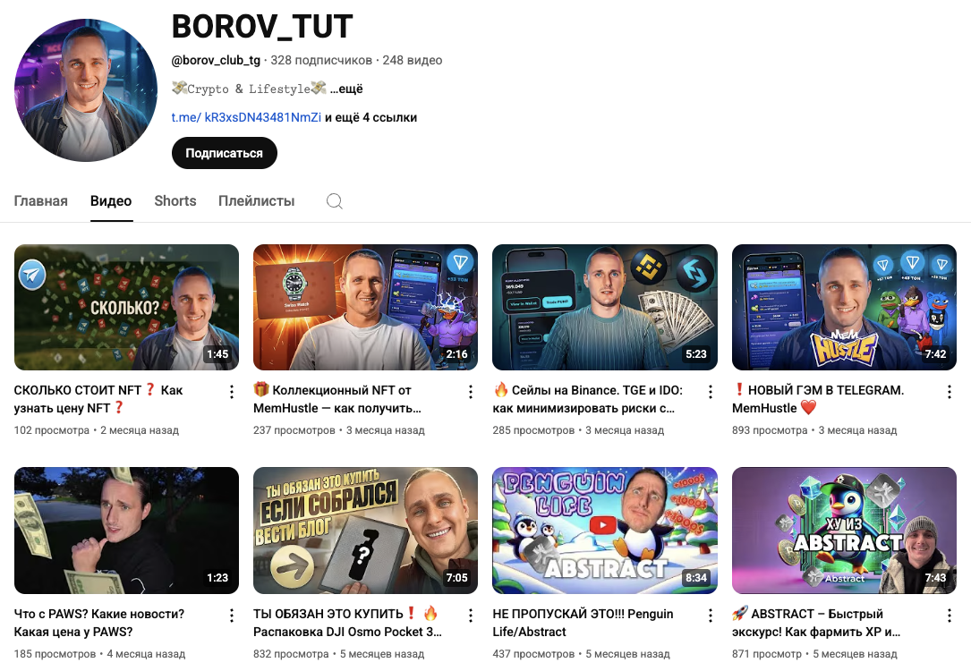 Ютуб-канал Borov Tut расположен по адресу borov club tg. Новых выпусков на нем нет уже более двух месяцев. На канале всего 328 подписчиков, а ролики получали по 200-800 просмотров.