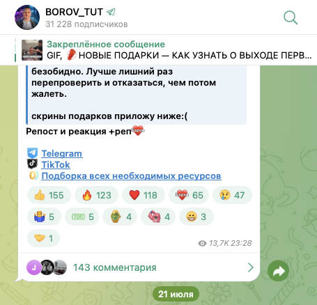 Как один из источников информации о tg-гифтах использовать каналы «Боров Тут» можно. Однако, критически важную информацию, которая поступает от автора данного проекта, рекомендуем проверять самостоятельно.