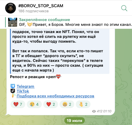 Есть у основателя проекта и еще один канала — Borov Stop Scam. В нем он уведомляет о мошеннических проектах. На данный аккаунт подписано 186 пользователей, а публикации получают по 300-500 просмотров.