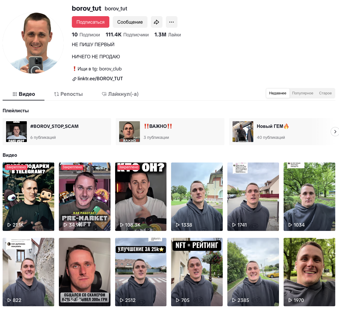 Borov Tut — аккаунты в соцсетях, на которых их владелец делится информацией о телеграмм-подарках. Зарабатывает основатель проекта на партнерских программах и рекламе.