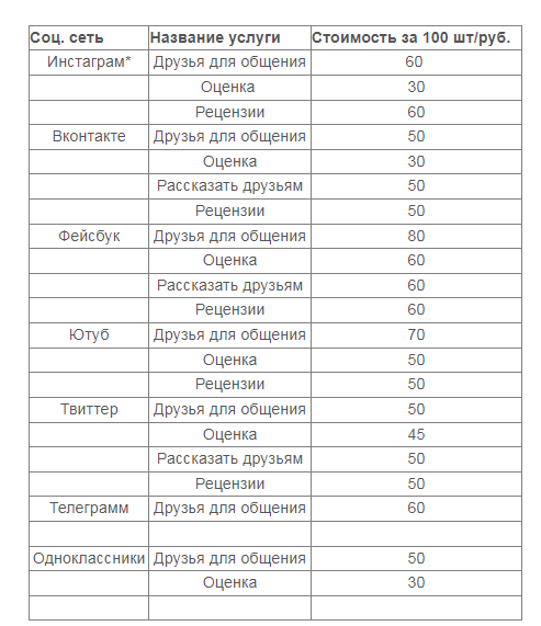 Самые высокие цены — в Фейсбуке. Услуги здесь стоят от 60 рублей. Добавление в друзья для общения обходится до 80 рублей. Ютуб и Твиттер занимают среднюю ценовую позицию. Их услуги оцениваются в 45-70 рублей за сто единиц. Телеграмм и Одноклассники завершают список с ценами от 30 до 60 рублей.