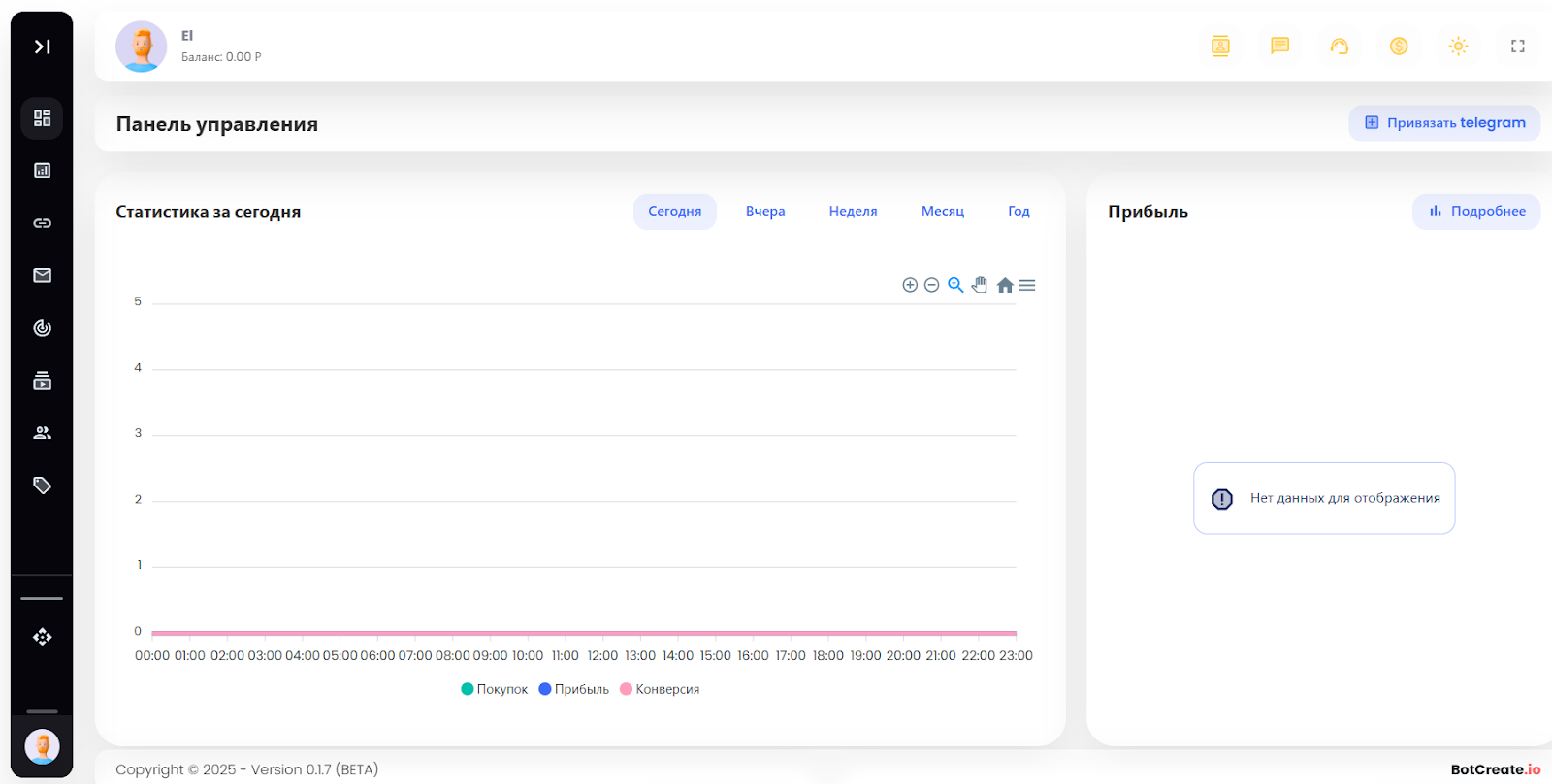 Статистика “за сегодня”, прибыль, транзакции, история выплат, конверсии. Создается ощущение, что внутри ничего не работает или не подключено, хотя интерфейс как будто обещает полноценную аналитику.