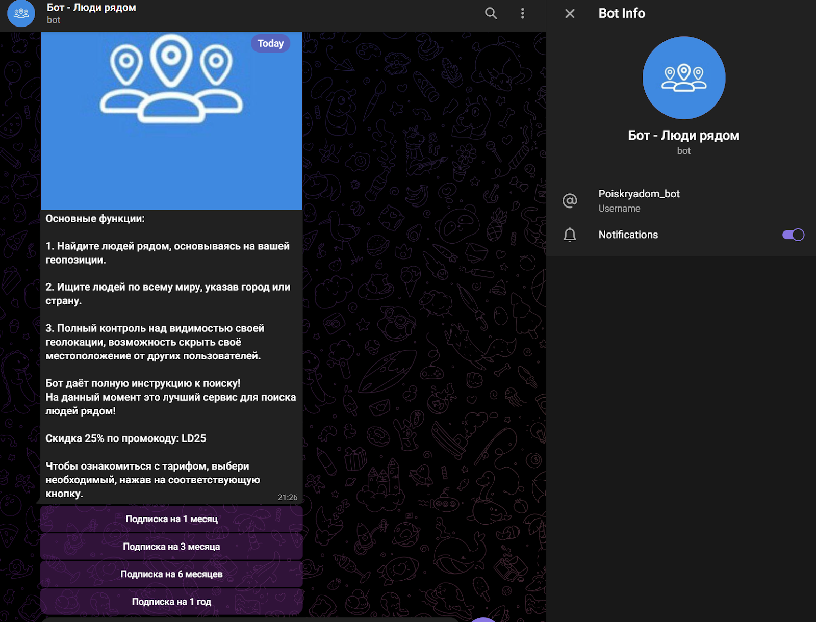 Телеграмм бот poiskryadom bot запущен анонимными разработчиками. Собственного открытого канала, сайта или социальных сетей у приложения нет. Пользователям сразу предлагают оформить подписку и приступить к поиску возможных друзей. Выбирать можно по геолокации, в то же время функционал позволяет скрыть свое местоположение. Бот позиционируется как отличный способ разыскать единомышленников в любых городах мира.