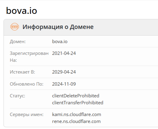 Домен bova io прошел регистрацию в мировой паутине 24 апреля 2021 года. Платежным агрегатором он стал 09 ноября 2024 года после обновления ПО. Свои услуги платформа оказывает пользователям 1 год и 2 месяца. За этот период владельцы сервиса не разместили на официальном сайте данных о лицензии, пользовательское соглашение, политику конфиденциальности и т. п.