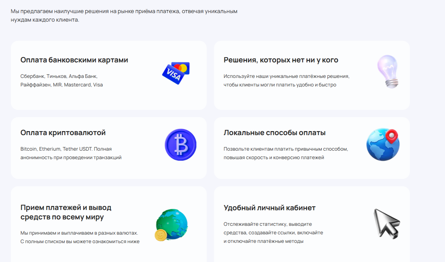 Платежный агрегатор поддерживает платежи из 12+ стран мира: Россия, Кыргызстан, Турция, Узбекистан и т. д. На платформе доступны разные способы оплаты: