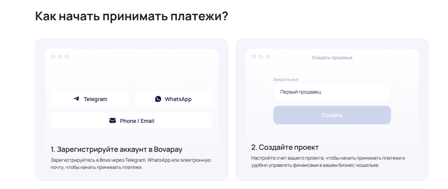 Воспользоваться опциями платежного агрегатора Bova Pay могут только владельцы учетных записей. Регистрация возможна с помощью Telegram, WhatsApp или email. После создания личного кабинета осуществляются настройки проекта и интеграция посредством API, SDK или готовых плагинов. При появлении проблем технического или финансового характера пользователи могут обратиться за помощью к круглосуточной техподдержке в письме на электронную почту info@bovapay io или в телеграм-канале @bovapayio.