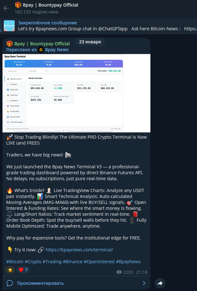 Поскольку никакой дополнительной информации, мы перешли в Bpay Bountypay Official Channel, где 162+ тысячи подписчиков. На самом деле такая большая аудитория является искусственной: на последнем посте, выложенном еще в январе набралось только 2 тыс. просмотров. Почему не появляются новые публикации – неясно.