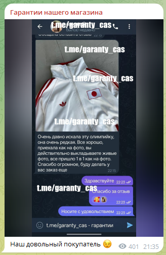 На первый взгляд, проект работал полностью законно. Владельцы ТГ-паблика «Магазин стильной одежды и кроссовок» даже создали отдельный канал с отзывами @ Garanty_cas. Якобы это должно послужить дополнительной гарантией честности.