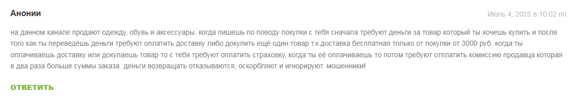 Еще одна клиентка по имени Анастасия написала, что ТГК «Магазин стильной одежды и кроссовок» обманул ее на 4 тыс. руб.
