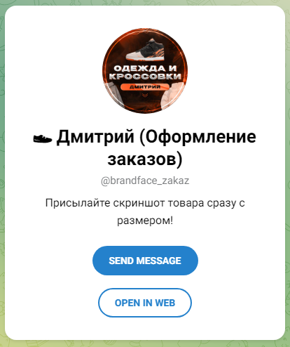 Brandface Zakaz — тг-магазин некоего Дмитрия, который продает брендовые вещи напрямую в мессенджере. Настоящее это имя или нет — неизвестно. «Магазин стильной одежды и кроссовок» предлагает покупателям товары по ценам намного ниже рынка. Звучит заманчиво, но давайте разберемся, откуда они берут столько дешевой продукции и нет ли в действиях организатора паблика признаков мошенничества.