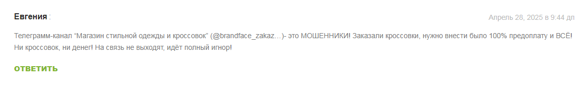 «Магазин стильной одежды и кроссовок» в ТГ: разоблачение обмана пользователей в проекте Дмитрия Brandface Zakaz