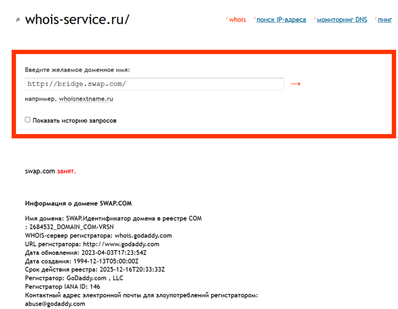 На сайте «Бридж Свап» отмечено о длительной работе площадки. Доменный адрес хоть и был зарегистрирован в 1994 году, но на самом деле указанному криптовалютному кошельку он перешел в 2023. Настораживает то, что сегодня эта площадка не загружается. Другой подозрительный момент – этот домен продлили до 16.12.2025 г.
