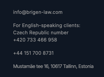 В футере сайта сказано, что офис компании находится в Таллине. Для связи с представителем фирмы предлагается обращаться по чешскому, британскому, казахстанскому и узбекистанскому телефонным номерам. Последние два варианта отображаются только в русскоязычной версии сайта. Также можно направить заявку на оказание услуг по Email: info brigen-law com.