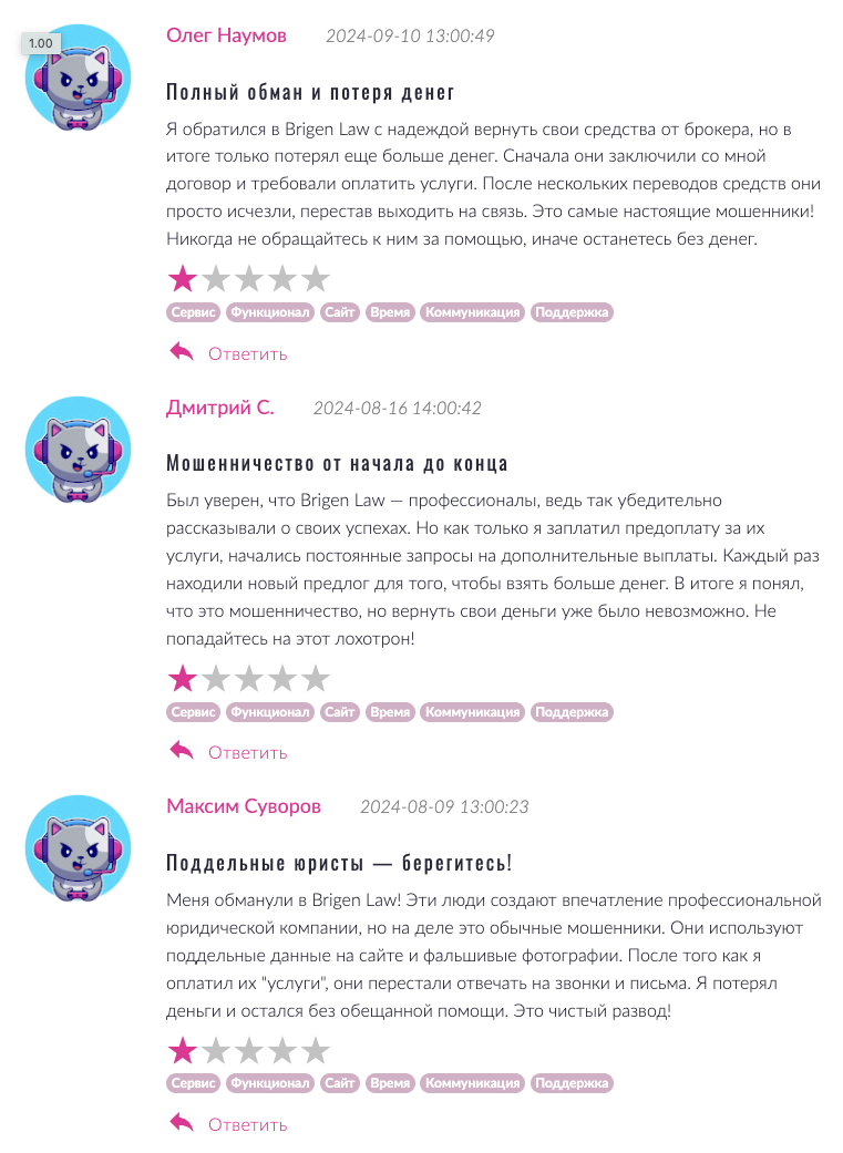 За пределами сайта brigen law com отзывы о компании исключительно негативные. Бывшие клиенты фирмы называют контору мошеннической.