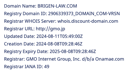 Мы также решили узнать, когда доменное имя brigen law com было зарегистрировано. Для этого запросили информацию о нем из сервиса Whois.В результате выяснили, что домен регистратор выдал 8 августа 2024-го года. То есть на момент написания этого обзора ресурс существует не более 2,5 месяцев. По другим адресам сайт недоступен. Из этого может следовать, что сама компания на рынке недавно.