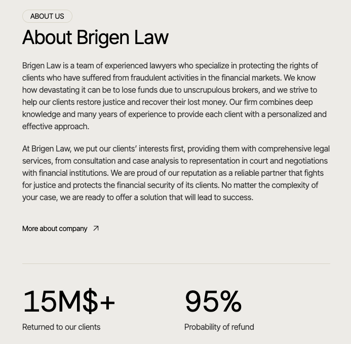 Brigen Law – юридическая компания, помогающая взыскивать деньги с мошенников. На ее сайте сообщается, что фирма работает уже 22 года, а результативность работающих в ней юристов – 95%.